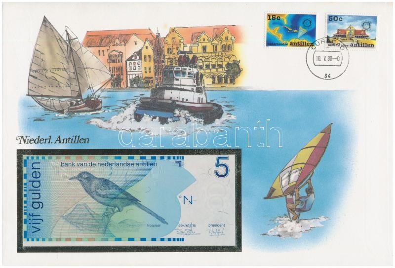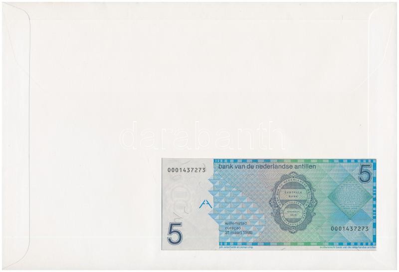 Beschreibung: Holland-Antillák 1986. 5G borítékban, alkalmi bélyeggel és bélyegzéssel T:I Netherlands Antilles 1986. 5 Gulden in envelope with stamps and cancellations C:UNC