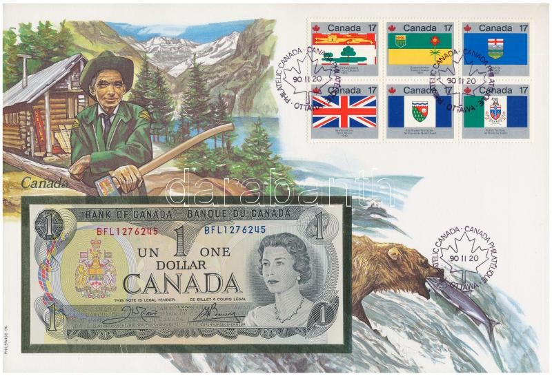 Canada 19... https://www.darabanth.com/de/361-Fernauktion/361.0/Numismatik/Umschlage-mit-Munzen-und-Banknoten~2000004/Kanada-1973-1USD-felbelyegzett-boritekban-belyegzessel-TI--Canada-1973-1USD-Dollars-in-envelop~II2074728