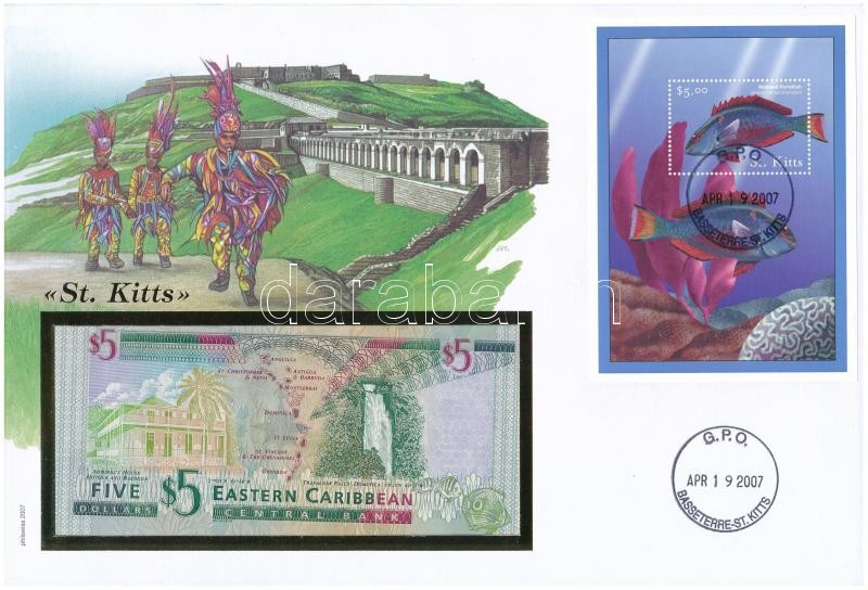 Beschreibung: Kelet-Karibi Államok/St. Kitts bankjegyes pecsételt és bélyeges boríték benne Kelet-Karibi Államok/Antigua és Barbuda 2000. 5$ T:I