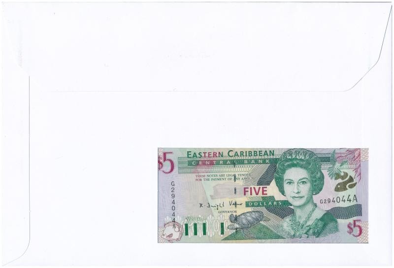 Eastern Caribbean States/St. Kitts sealed envelope with stamp, inside Eastern Caribbean States/Antigua and Barbuda 2000. 5 Dollar banknote C:I