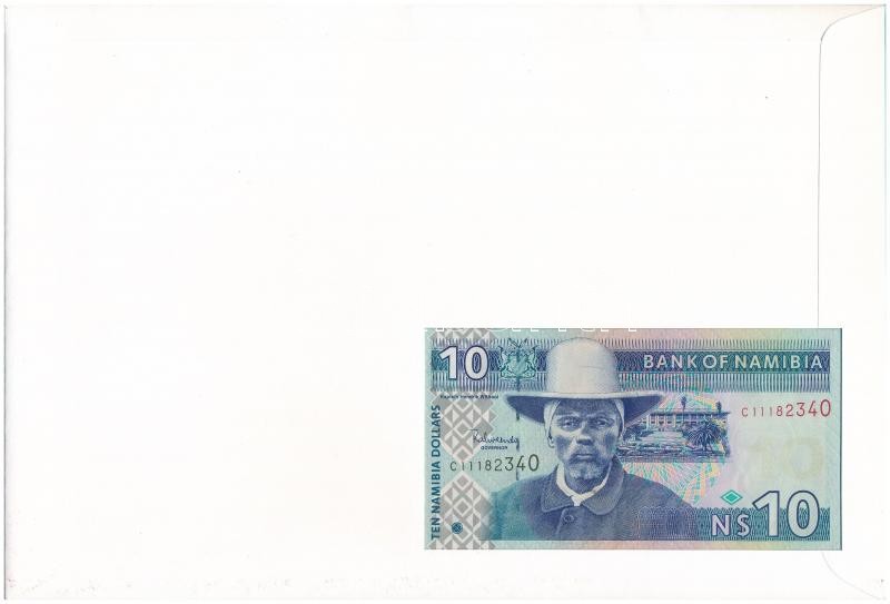 Namíbia 2001. 10D felbélyegzett borítékban, bélyegzéssel T:1 Namibia 2... https://www.darabanth.com/de/361-Fernauktion/361.0/Numismatik/Umschlage-mit-Munzen-und-Banknoten~2000004/Namibia-2001-10D-felbelyegzett-boritekban-belyegzessel-T1-Namibia-2001-10-Dollar-in-envelo~II2076524