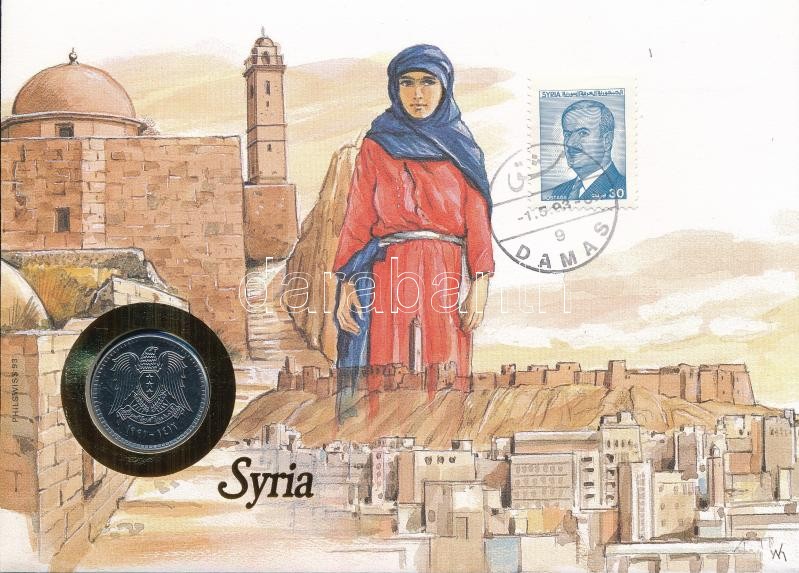 Syria 1991. 1 Pound in envelope with stamp and cancellation, with German language description C:UNC