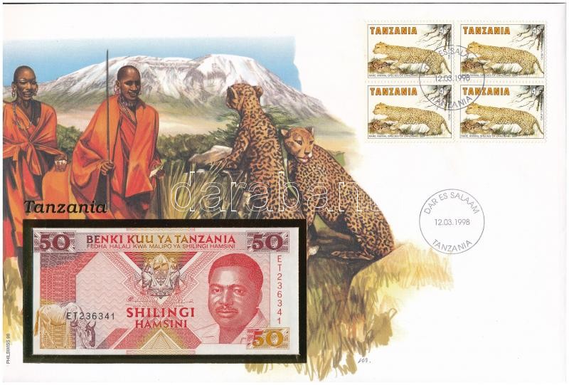 Tanza... https://www.darabanth.com/de/361-Fernauktion/361.0/Numismatik/Umschlage-mit-Munzen-und-Banknoten~2000004/Tanzania-1993-50Sh-felbelyegzett-boritekban-belyegzessel-TI--Tanzania-1993-50-Shilingi-in~II2075932