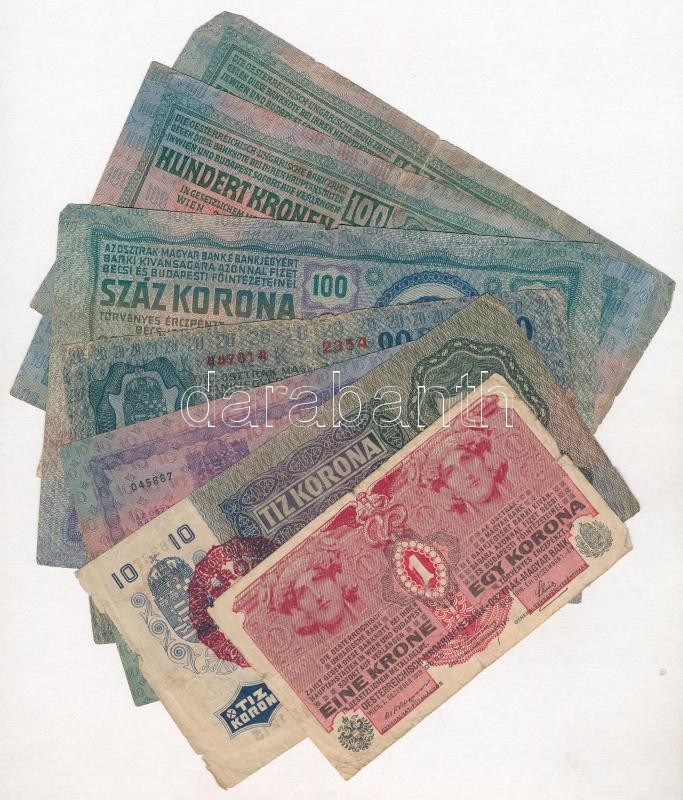 1912-1920. 8db-os vegyes magyar korona bankjegy tétel T:III,III- https://www.darabanth.com/de/361-Fernauktion/361.0/Numismatik/Ungarische-Banknoten~2000007/1912-1920-8db-os-vegyes-magyar-korona-bankjegy-tetel-TIII-III-~II2084227