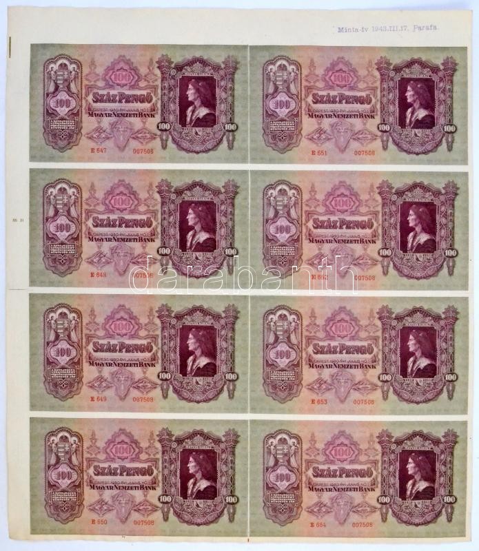 1930. 100P 8db-os vágatlan minta ívben, "1943. III. 17." dát...