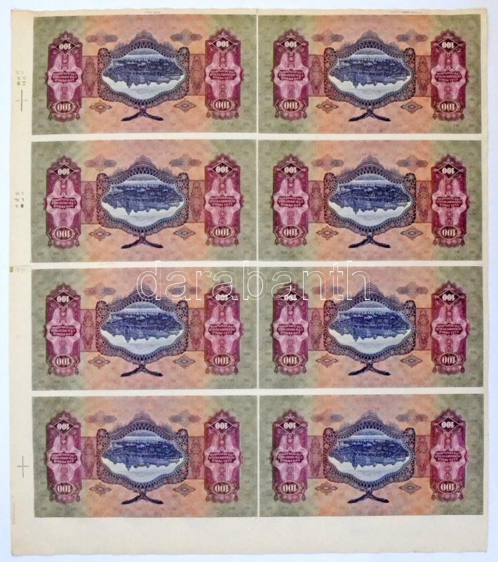 1930. 100P 8db-os vágatlan minta ívben, "1943. III. 17." dátummal, illesztőkerettel T:I- RR!/ Hungary 1930. 100 Pengő in a specimen sheet of 8 with "1943. III. 17." date, with sheet edge frame C:AU VERY RARE!