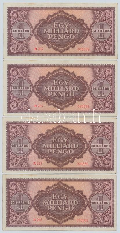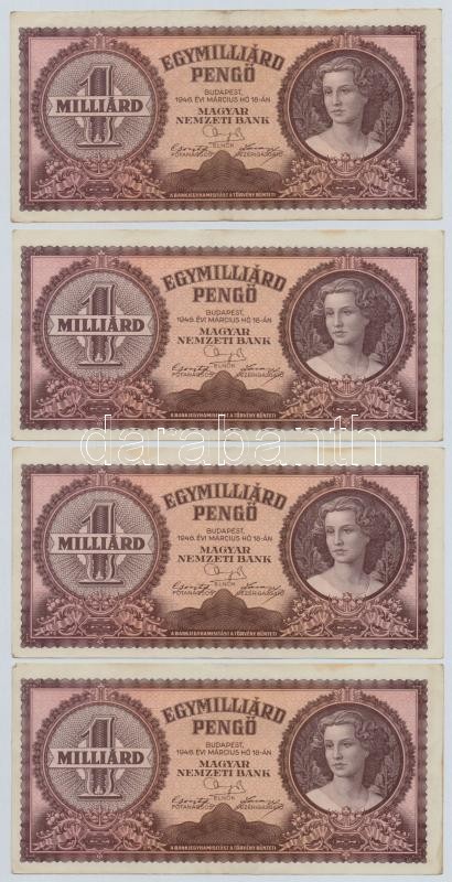 1946. 1.000.000.000P (4x) sorszámkövetők T:II-,III https://www.darabanth.com/de/361-Fernauktion/361.0/Numismatik/Ungarische-Banknoten~2000007/1946-1000000000P-4x-sorszamkovetok-TII-III~II1909066