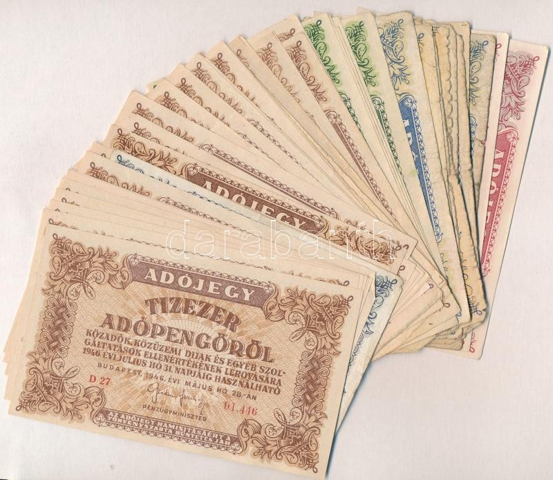 1946. 10.000AP-10.000.000AP 39db-os vegyes magyar adópengő tétel, közt... https://www.darabanth.com/de/361-Fernauktion/361.0/Numismatik/Ungarische-Banknoten~2000007/1946-10000AP-10000000AP-39db-os-vegyes-magyar-adopengo-tetel-kozte-tobb-forditott-cimere~II2083008