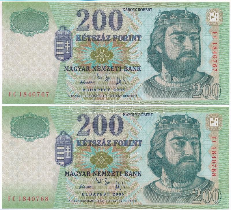 2005. 200Ft "FC" (2x) sorszámkövetők T:I,I- https://www.darabanth.com/de/361-Fernauktion/361.0/Numismatik/Ungarische-Banknoten~2000007/2005-200Ft-FC-2x-sorszamkovetok-TI-I-~II2079693