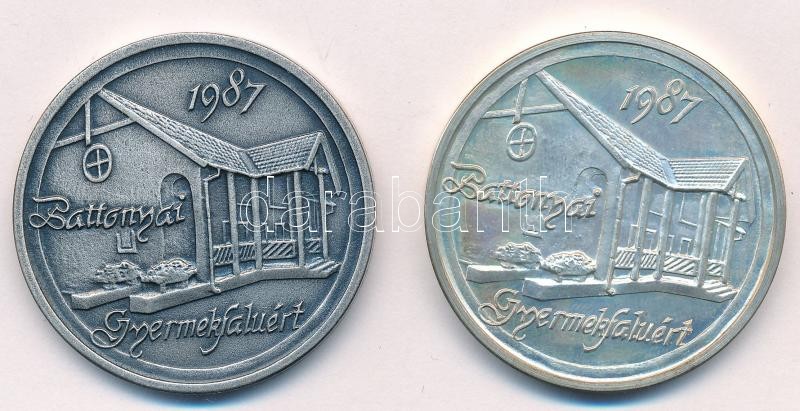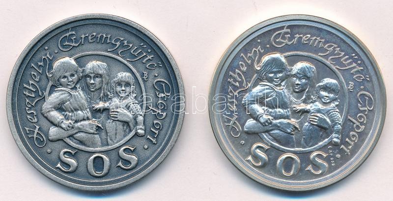 Bogár Lívia (1957-) 1987. "Keszthelyi Éremgyűjtő Csoport SOS / Battonyai Gyermekfaluért" ezüstpatinázott Br és Ag emlékérem pár (35,93g/0.835/42,5mm) T:1 Adamo KE48