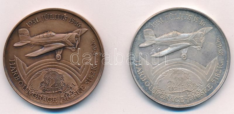 Bozó Gyula (1913-2004) 1991. "60 éves a magyar óceánrepülés Endresz György - Magyar Sándor / Harbour Grace - Bicske" Br és Ag emlékérem pár (36,78g/0.925/42,5mm) T:1 patina