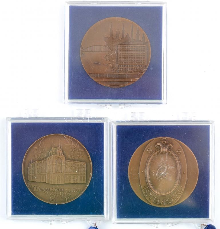 Beschreibung: Lapis András (1942-) DN "Hotel Hungária Szeged" Br emlékérem (42,5mm) + "HungarHotels / Hotel Tisza Szeged" Br emlékérem (42,5mm) + "Hotel Royal / HungarHotels Szeged" Br emlékérem (42,5mm) mind sérült ÁPV műanyag tokban T:1,1-