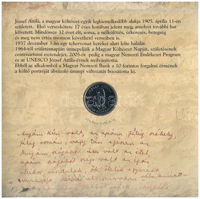 Beschreibung: 2005. 1Ft-100Ft (7xklf) forgalmi sor szettben + 2005. 10Ft "József Attila" T:BU Adamo FO39