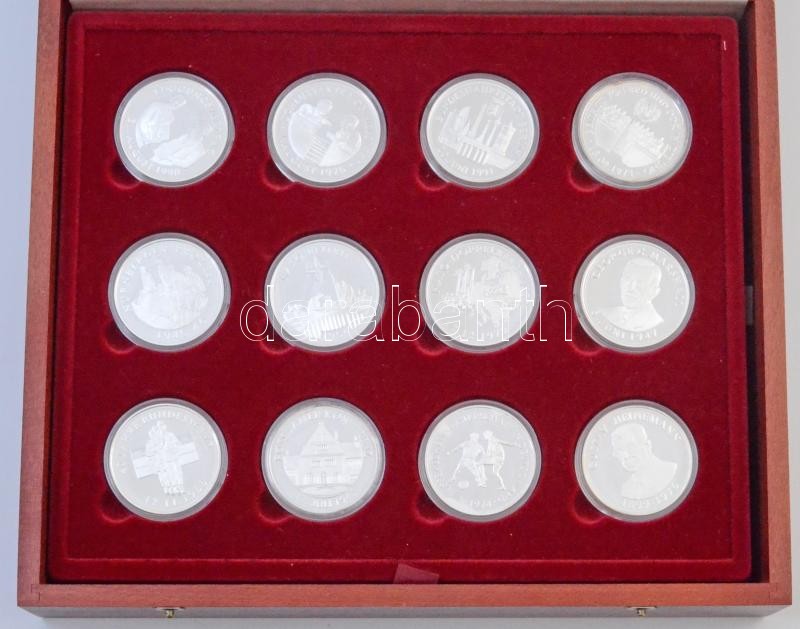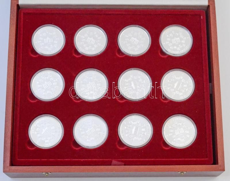 Németország 1995-1997. "50 Jahre Frieden" jelzett Ag, a Második Világháború utáni német történelmi eseményeket feldolgozó emlékérem szett (24xklf) három tálcás fa díszdobozban, az érmek német nyelvű leírással és tanúsítvánnyal (érmenként ~20g/0.999/40mm) T:PP kis patina, fo.