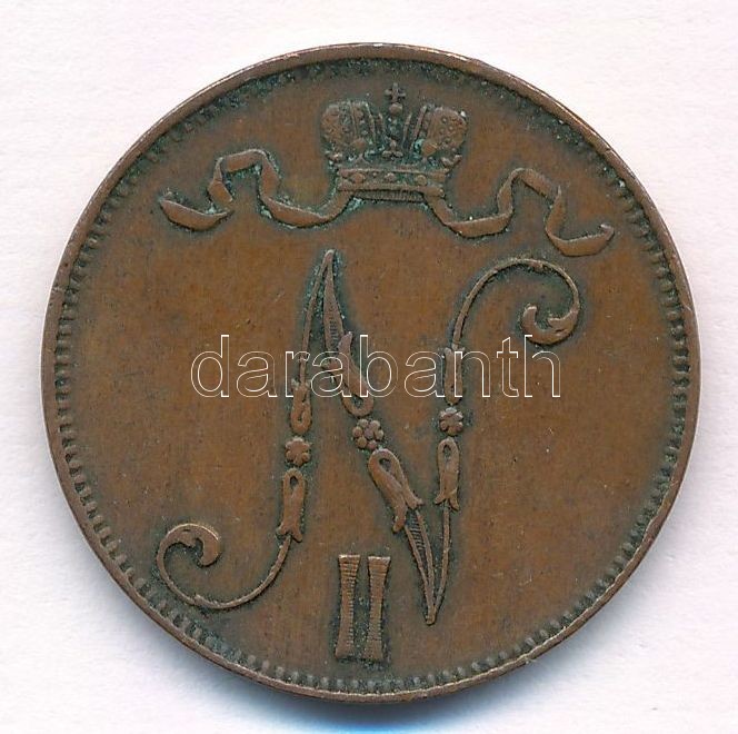 Finland 1906. ... https://www.darabanth.com/de/361-Fernauktion/361.0/Numismatik/Weltweit-Munzen~2000014/Finnorszag-1906-5p-Cu-II-Miklos-T2-ph--Finland-1906-5-Pennia-Cu-Nicholas-II-CXF-edge-er~II2070248