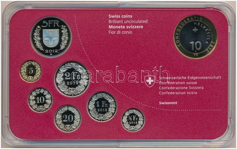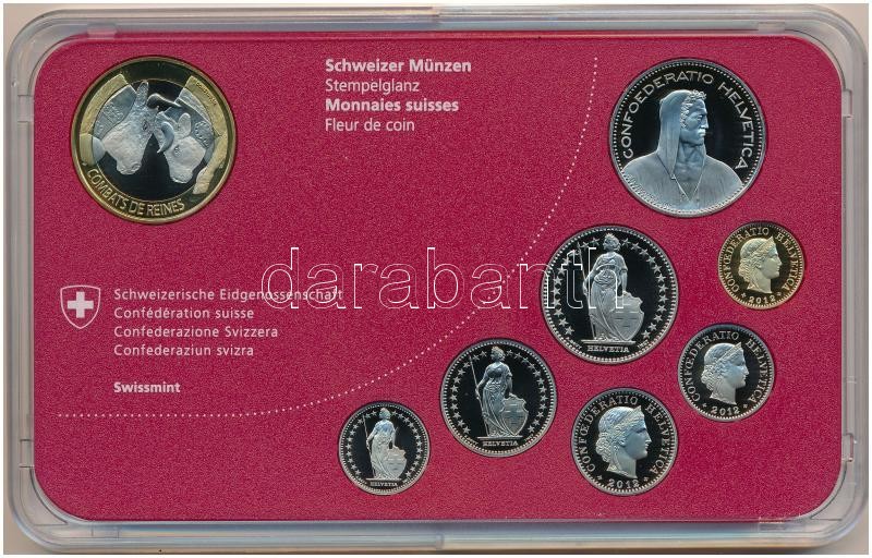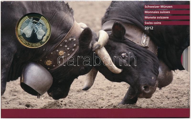 Svájc 2012B 5r - 10Fr (8xklf) forgalmi sor műanyag dísztokban, benne 10Fr "Tehén viadal" forgalmi emlékkiadás T:BU Switzerland 2012B 5 Rappen - 10 Francs (8xdiff) coin set in plastic case, with 10 Franc "Cow Fighting" commemorative issue C:BU