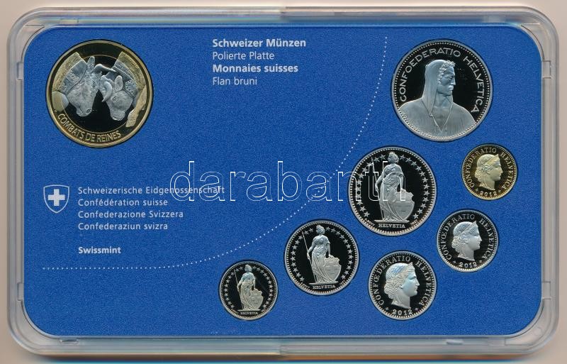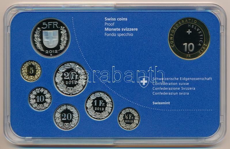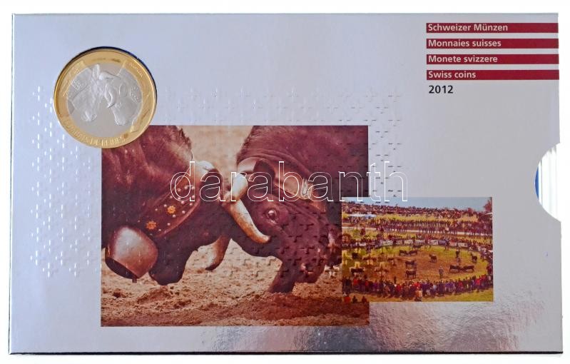 Svájc 2012B 5r - 10Fr (8xklf) forgalmi sor műanyag dísztokban, benne 10Fr "Tehén viadal" forgalmi emlékkiadás T:PP Switzerland 2012B 5 Rappen - 10 Francs (8xdiff) coin set in plastic case, with 10 Franc "Cow Fighting" commemorative issue C:PP