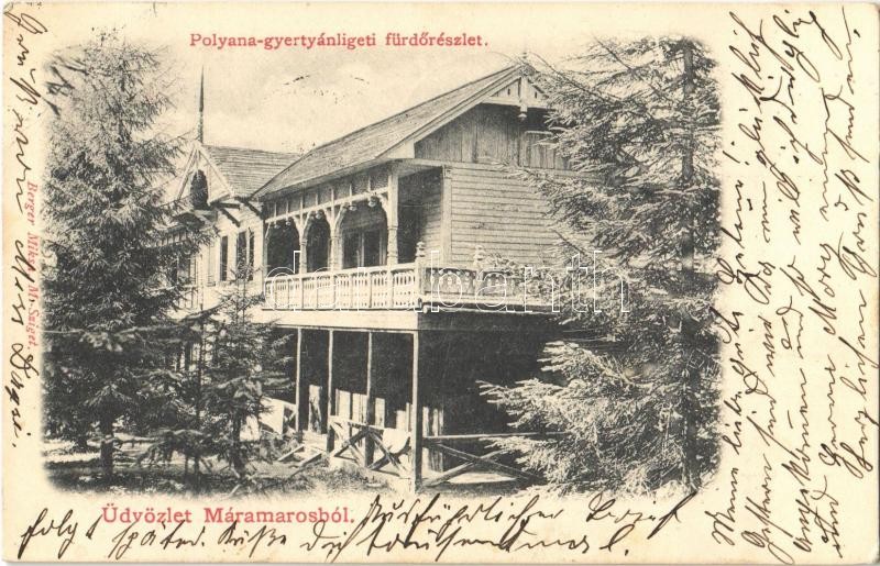Beschreibung: 1903 Gyertyánliget, Polyana-Gyertyánliget, Kabola Polyána, Kobyletska Poliana (Máramaros, Maramures); fürdő részlet / spa (EB)