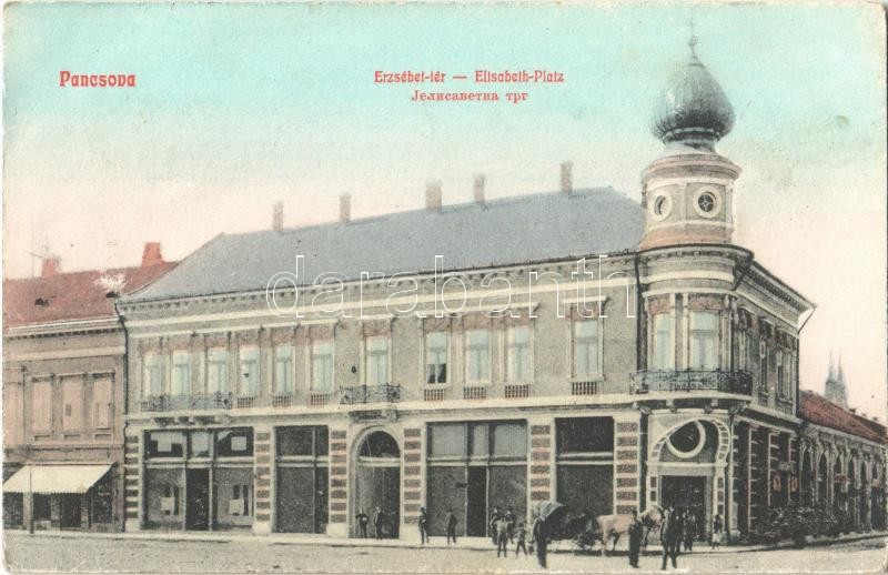 Beschreibung: 1908 Pancsova, Pancevo; Erzsébet tér, üzlet. 223. Miloszavljevics Vazul kiadása / square, shops