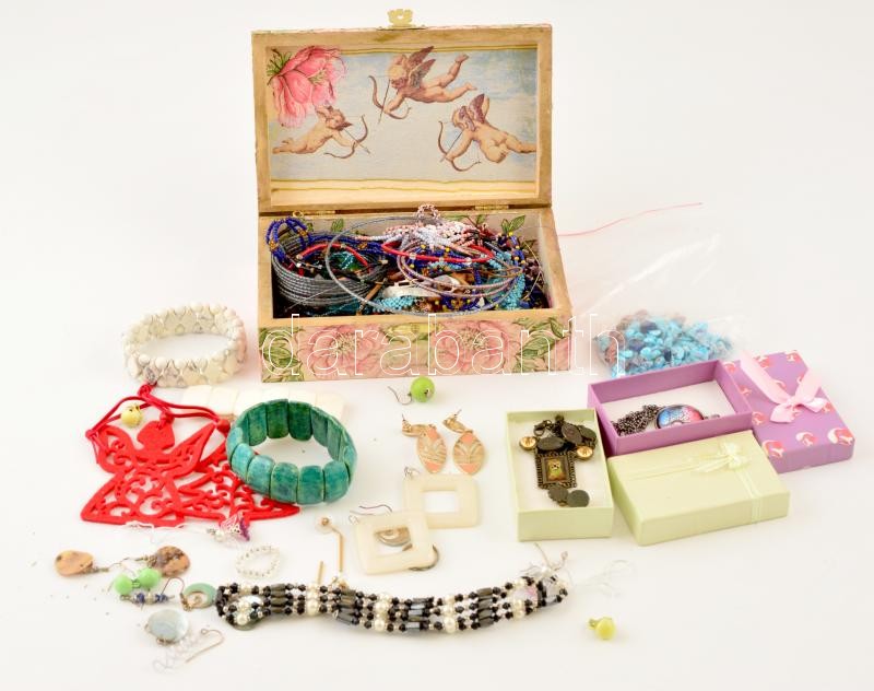 Beschreibung: Vegyes bizsu tétel, ásvány és mágneses, gyöngyház karkötők, zománcozott ékszerek, fűzhető howlit gyöngyök, ékszertartó dobozzal, 17,5×11×6 cm