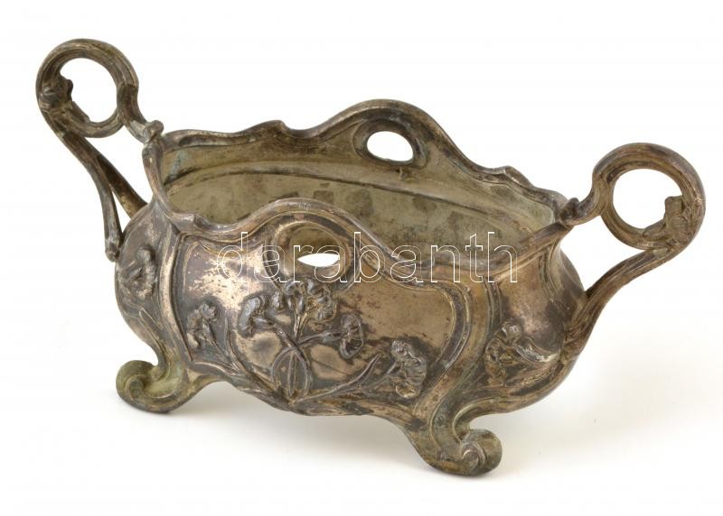 Beschreibung: cca 1910 szecessziós ón jardiniere, jelzés nélkül, kopott, üvegbetét nélkül, 24×9 cm, m: 11,5 cm