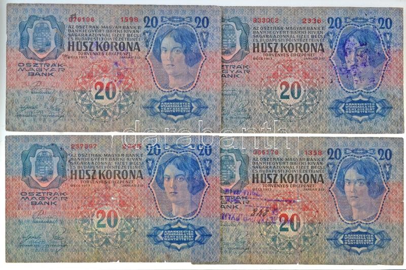 Beschreibung: 1913. 20K (4xklf) nehezen olvasható, cirill betűs felülbélyegzésekkel T:III,III- szakadás / Hungary 1913. 20 Korona (4xdiff) with hardly readable cyrillic cancellations C:F,VG tear