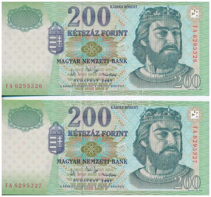2007. 200Ft (2x) sorszámkövetők "FA 6295326 - FA 6295327" T:I https://www.darabanth.com/de/362-Fernauktion/362.0/Numismatik/Ungarische-Banknoten~1500007/2007-200Ft-2x-sorszamkovetok-FA-6295326-FA-6295327-TI~II2093217