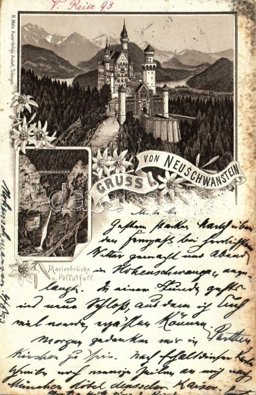 Beschreibung: 1893 (Vorläufer!!!) Schwangau, Neuschwanstein Schloss, Marienbrücke und Pöllatfall / castle, bridge and waterfall. H. Metz Art Nouveau, floral, litho (fa)