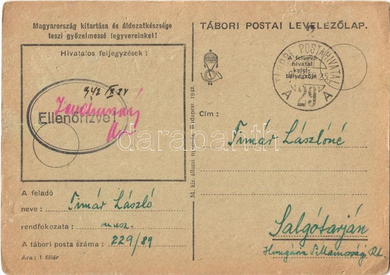 1940 Timár László zsidó 229/89. KMSZ (közérdekű munkaszolgálatos) levele feleségének Timár Lászlónénak a munkatáborból / WWII Letter from a Jewish labor serviceman to his wife. Judaica (EK)