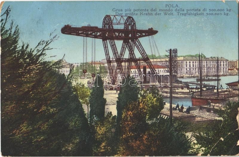 1913 Pola, Pula; Der größte Krahn der Welt. Tragfähigkeit 300,000 kg / A világ legnagyobb daruja, teherbírása 300,000 kg, hajógyár. Photochrom G. Fano 1912/13. / the largest crane in the world, shipyard (EB)