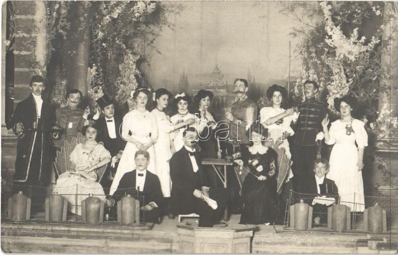 Beschreibung: 1909 Brassó, Kronstadt, Brasov; színházi csoportkép színészekkel / theatre group photo with actors and actresses