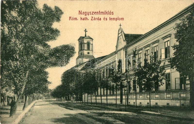 1909 Nagyszentmiklós, Sannicolau Mare; Római katolikus zárda és templom. W. L. Bp. 2116. Kiadja Wiener Náthán / Catholic church and nunnery + Perjámos-Valkány 90. sz. vasút mozgóposta (kis szakadás / small tear)