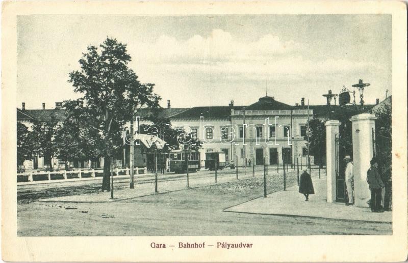 Nagyszeben, Hermannstadt, Sibiu; Gara / Bahnhof / Pályaudvar, vasútállomás, villamos a megállóban. Jos. Drotleff Nr. 21. / railway station, tram stop (EK)
