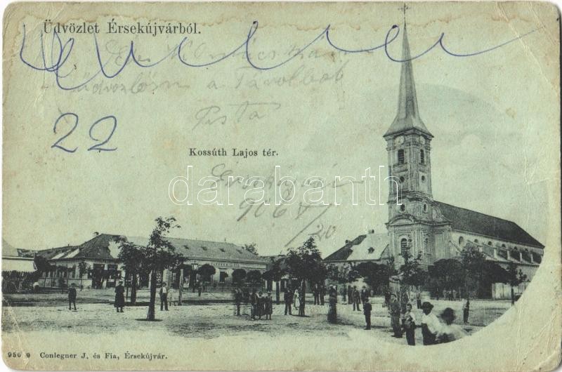 Beschreibung: 1906 Érsekújvár, Nové Zámky; Kossuth Lajos tér, templom, gyógyszertár, Conlegner J. és fia üzlete és saját kiadása / square, pharmacy, church, shop (EB)