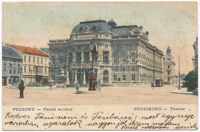 1908 Pozsony, Pressburg, Bratislava; Városi színház, villamos / Theat... https://www.darabanth.com/de/363-Fernauktion/363.0/Ansichtskarten/Slowakei~1500007/1908-Pozsony-Pressburg-Bratislava-Varosi-szinhaz-villamos-Theater-city-theatre-tram-a~II2093637