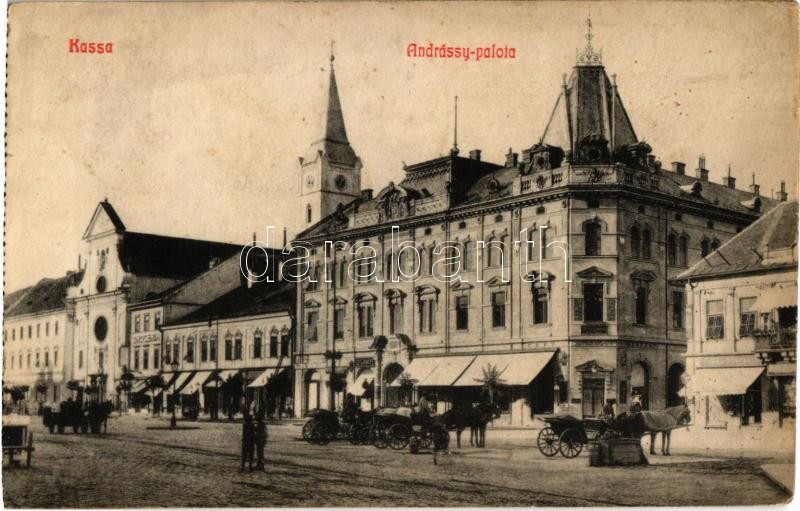 1914 Kassa, Kosice; Andrássy palota, Andrássy kávéház, drogéria (gyógyszertár), Gilányi, Varga Bertalan üzlete és saját kiadása / palace, café, pharmacy, shops, publisher's shop - képeslapfüzetből / from postcard booklet (r)