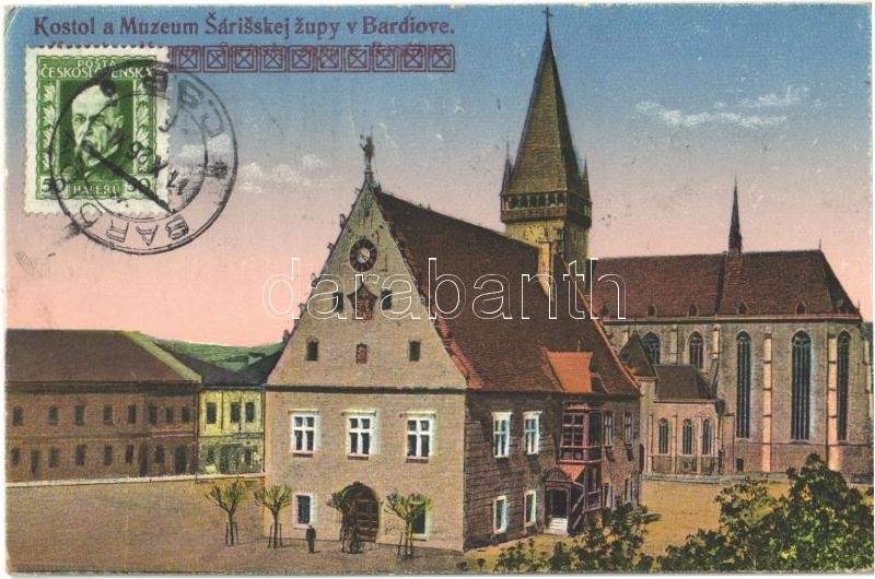 1926 Bártfa, Bártfafürdő, Bardejovské Kúpele, Bardiov, Bardejov; Kostol a Muzeum Sárisskej zupy / Régi városháza (Sáros vármegyei múzeum) és templom / old town hall (Sáros County museum), church (EK)