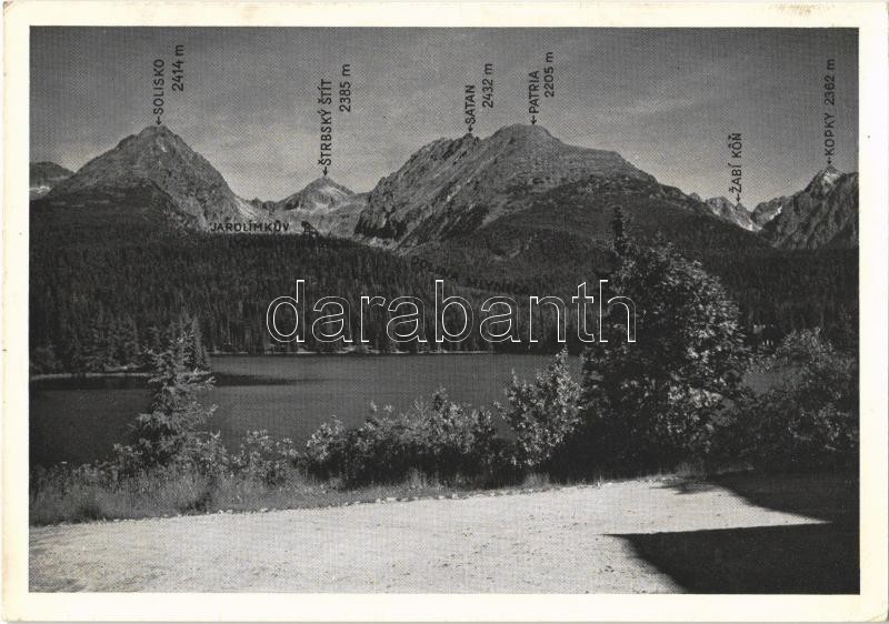 Tátra, Magas-Tátra, Vysoké Tatry; Strbské pleso, Solisko, Strbsky stít, Satan, Patria, Kopky / Csorba-tó, Szoliszkó, Csorbai-csúcs, Sátán, Pátria, Kopki csúcsok / lake, mountains (14,9 cm x 10,4 cm)