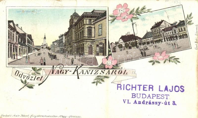 Beschreibung: 1897 Nagykanizsa, utcaképek. Mair József Art Nouveau, floral, litho (szakadások / tears)