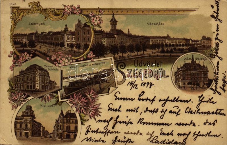 Beschreibung: 1897 Szeged, Városi színház, Széchenyi tér, Híd utca, Kálvária, Széképület, Városháza. Art Nouveau, floral, litho (Rb)