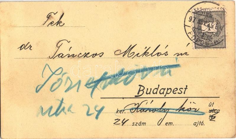 Beschreibung: 1897 (Vorläufer!) Budapest V. Kunz József és társa üzlete, reklámlap. Deák tér, Art Nouveau