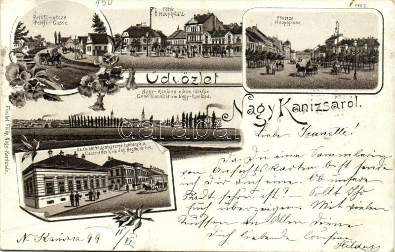 1899 Nagykanizsa, Petőfi utca, Fő tér és utca, Cs. és kir. 48. gyaloge... https://www.darabanth.com/de/363-Fernauktion/363.0/Ansichtskarten/Ungarn~1500005/1899-Nagykanizsa-Petofi-utca-Fo-ter-es-utca-Cs-es-kir-48-gyalogezred-laktanyaja-Fischel~II2065324