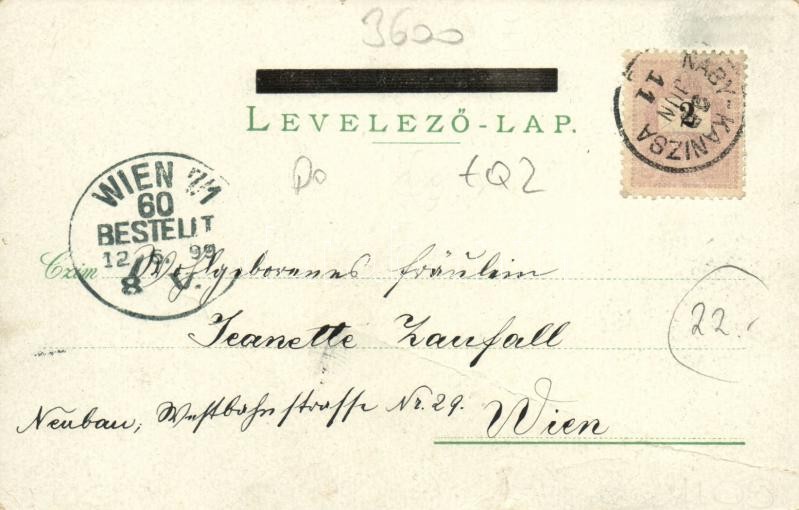 Beschreibung: 1899 Nagykanizsa, Petőfi utca, Fő tér és utca, Cs. és kir. 48. gyalogezred laktanyája. Fischel Fülöp Art Nouveau, floral, litho (fa)