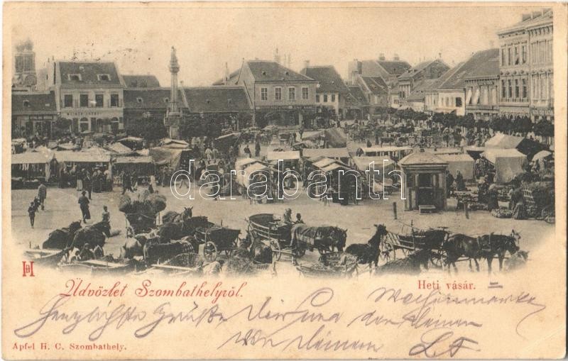 Beschreibung: 1899 Szombathely, Heti vásár, piac, Stirling, Weimer József, Deutsch József és Társa üzletei (EK)