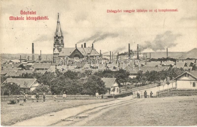 Beschreibung: 1909 Diósgyőr (Miskolc), Vasgyár látképe az új templommal