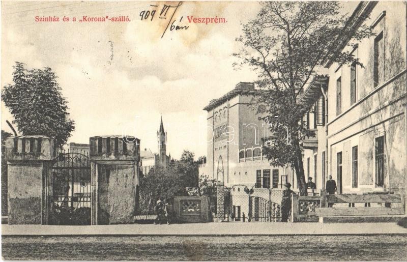 1909 Veszprém, Színház és a Korona szálló. Krausz Ármin kiadása https://www.darabanth.com/de/363-Fernauktion/363.0/Ansichtskarten/Ungarn~1500005/1909-Veszprem-Szinhaz-es-a-Korona-szallo-Krausz-Armin-kiadasa~II2095775