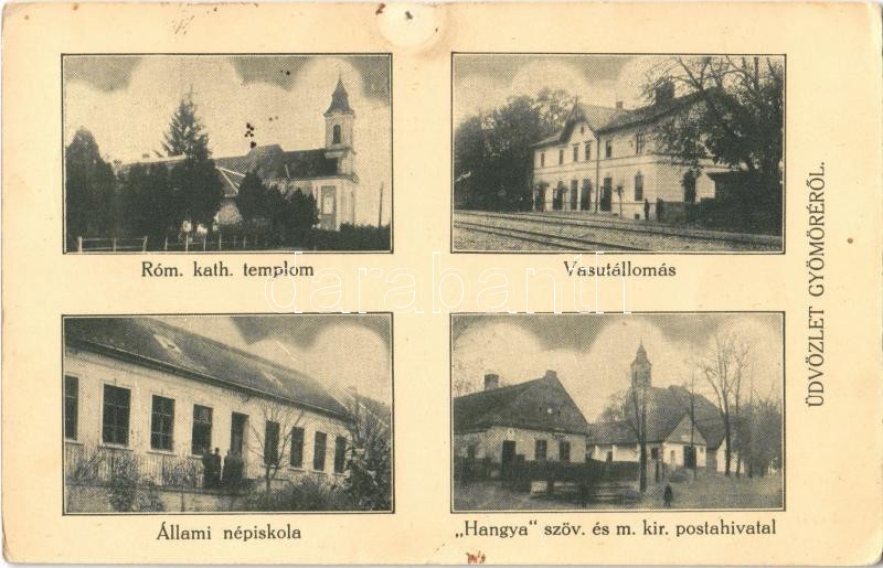 1927 Gyömöre, Római katolikus templom, Vasútállomás, Állami népiskola, Hangya Szövetkezet üzlete, M. kir. posta hivatal. Szilágyi Arthur műterméből (lyuk / pinhole)