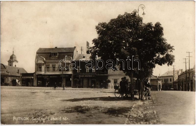Beschreibung: 1929 Putnok, Serényi László tér, Diamant Ignácné, Weingarten Henrik, Róth Bernát, Danberg Mór, Blau József üzlete, kerékpáros fiúk