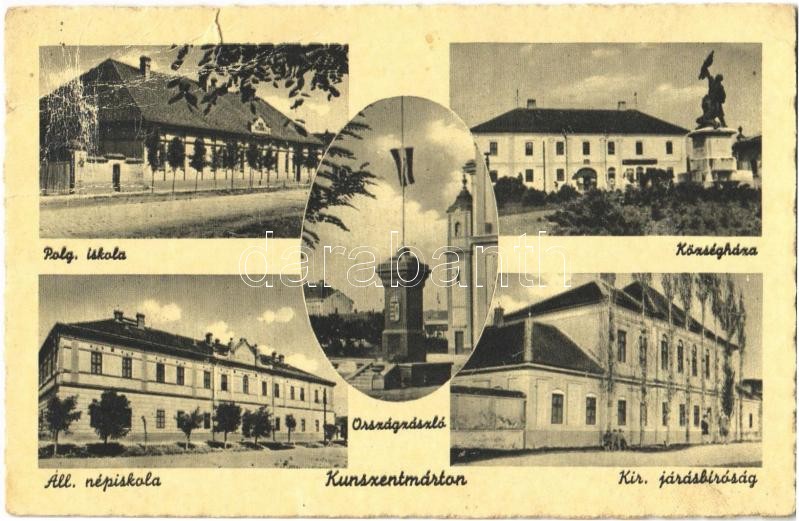 Beschreibung: 1948 Kunszentmárton, Polg. iskola, Községháza, Országzászló, Áll. népiskola, Kir. járásbíróság (szakadás / tear)