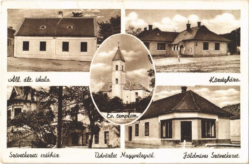Beschreibung: 1950 Nagyveleg, Állami általános iskola, Evangélikus templom, Községháza, Földmíves Szövetkezet, Szövetkezeti székház